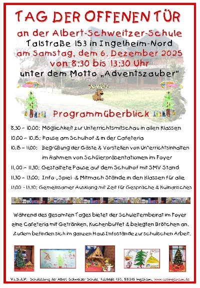 Mi., 19.11.: Vorstellungsgespräch-Training der 9V/10 mit Rotary Mo., 24.11.: Studientag, unterrichtsfrei Di., 25.11.: Schulversammlung 2 mit SMV-Wahl Mi-Do., 26. - 27.11.: Berufsberatung Klasse 9V/10 Sa., 06.12.: Tag der offenen Tür Mo., 08.12.: unterrichtsfrei als Ausgleichstag Do., 11.12.: Fußballer beim Fritz-Walther-Cup Bingen Di-Do., 16.-18.12.: Klassenfahrt 7/8 nach Koblenz Fr., 19.12.: Schulversammlung 3 & Jahresausklang Sa., 20.12.: Weihnachtsferien bis Mi., 07.01.2026